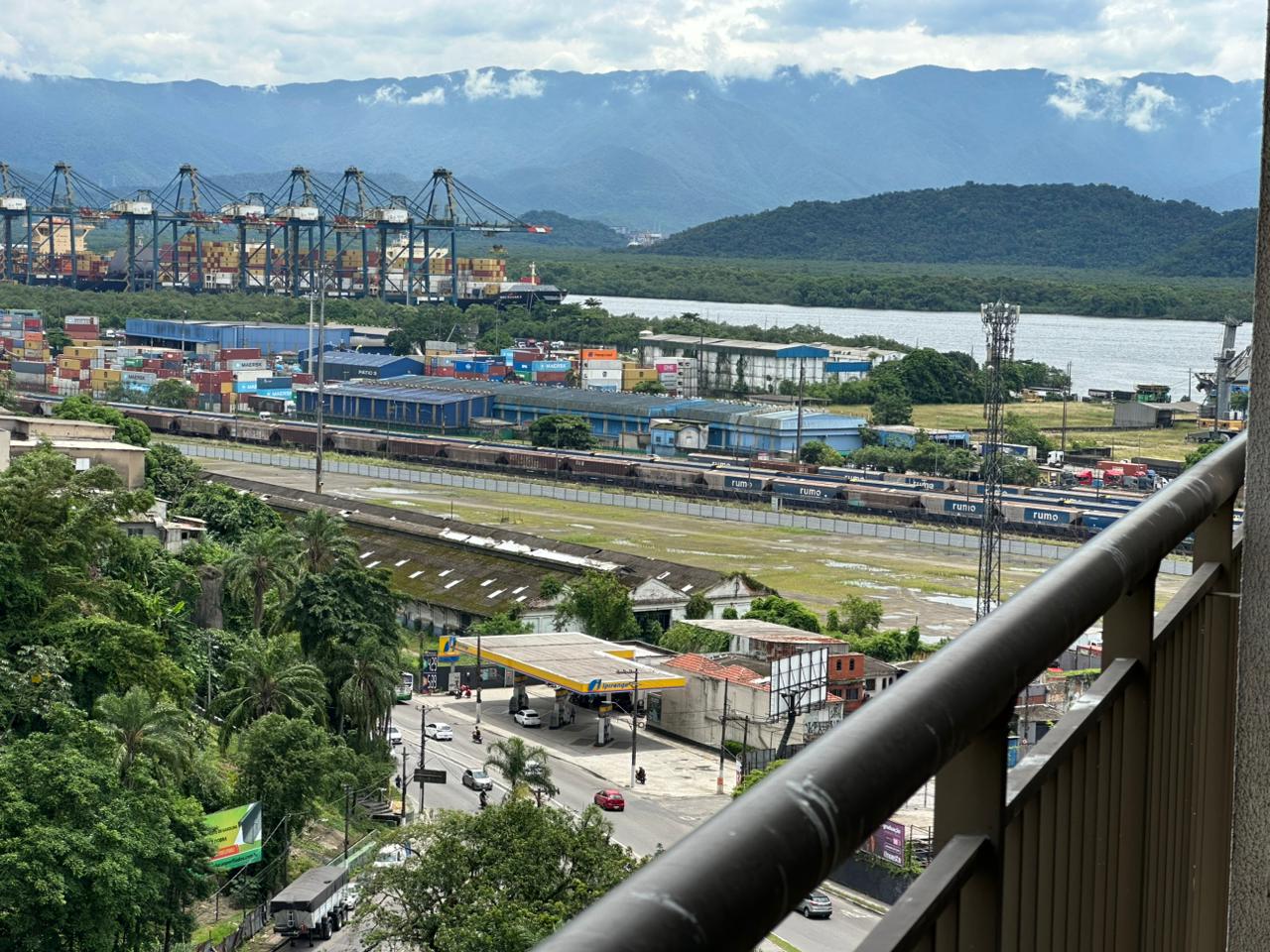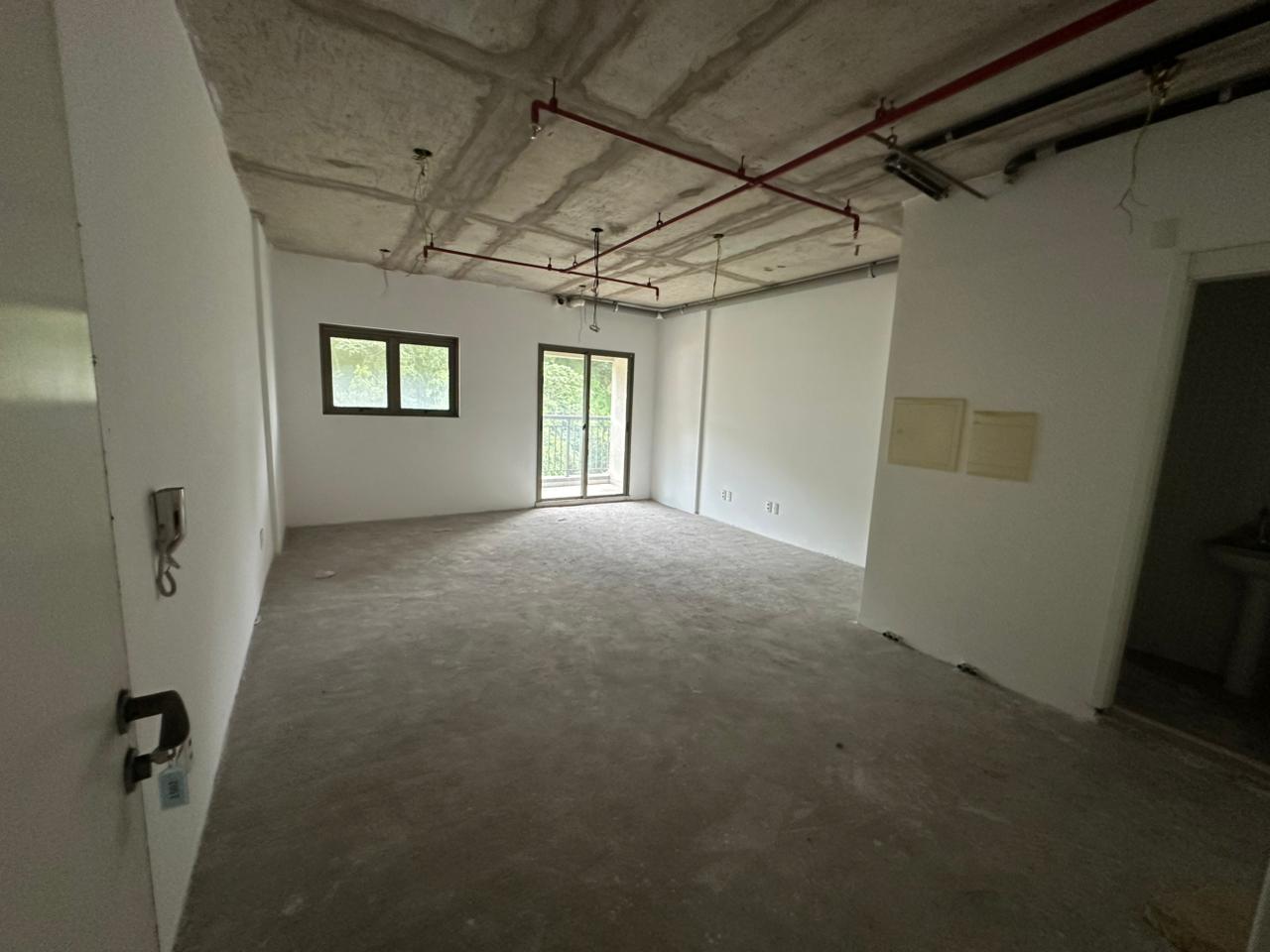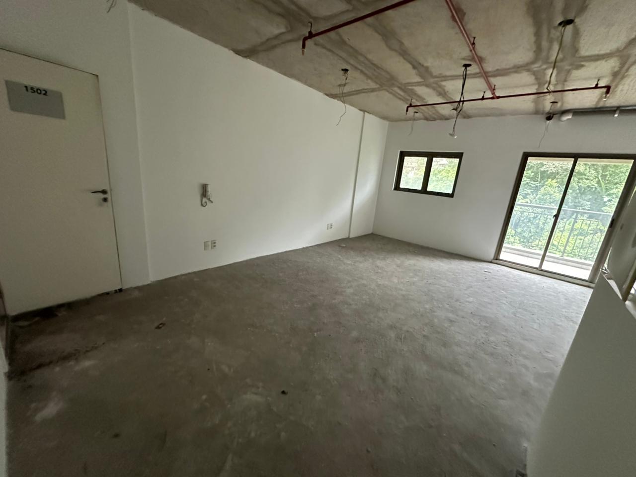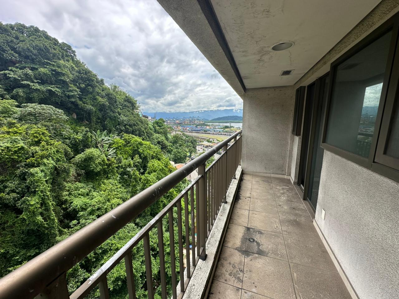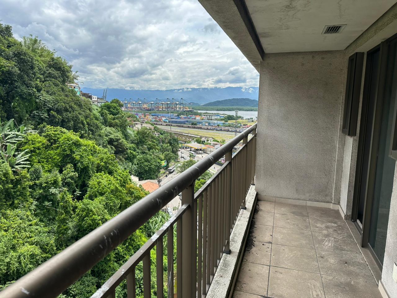 Sala com 42 m², sistema de incêndio, piso rebaixado e varanda de onde você avista o Porto de Santos.