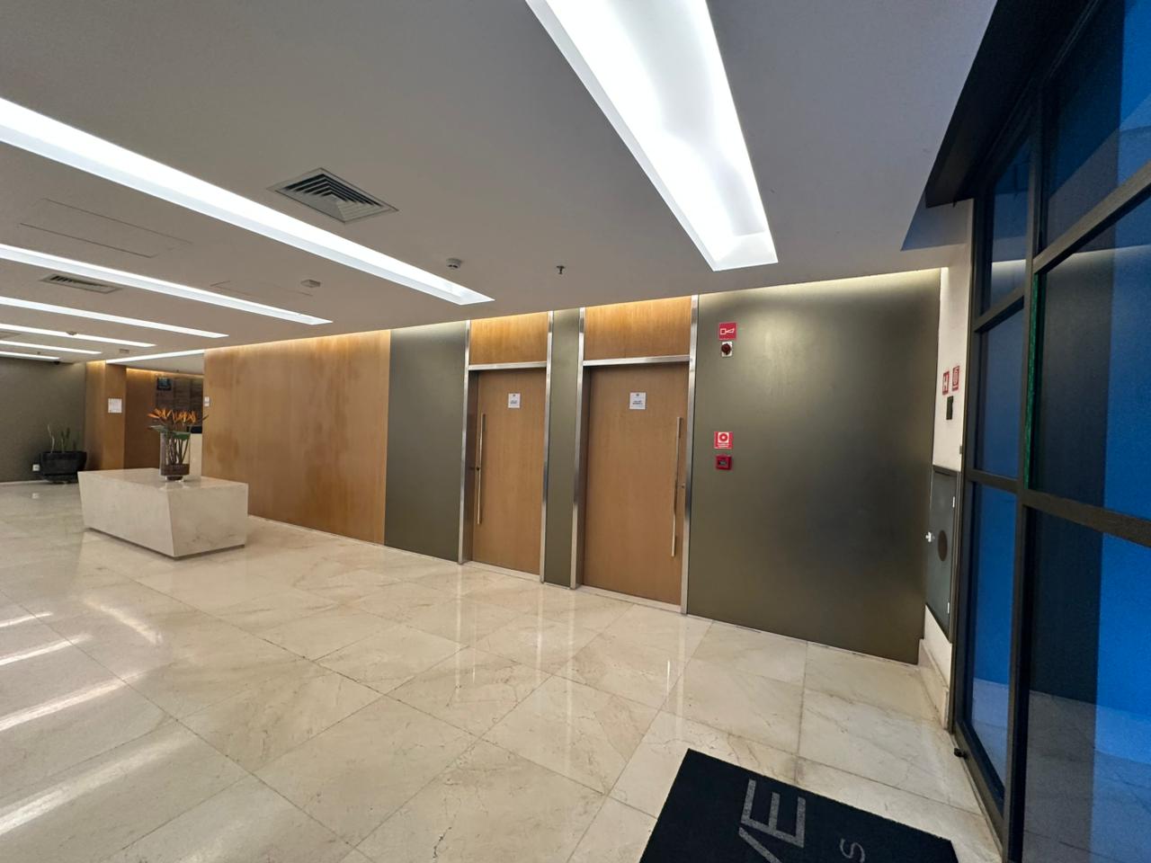 Cinco elevadores, catracas de acesso.
