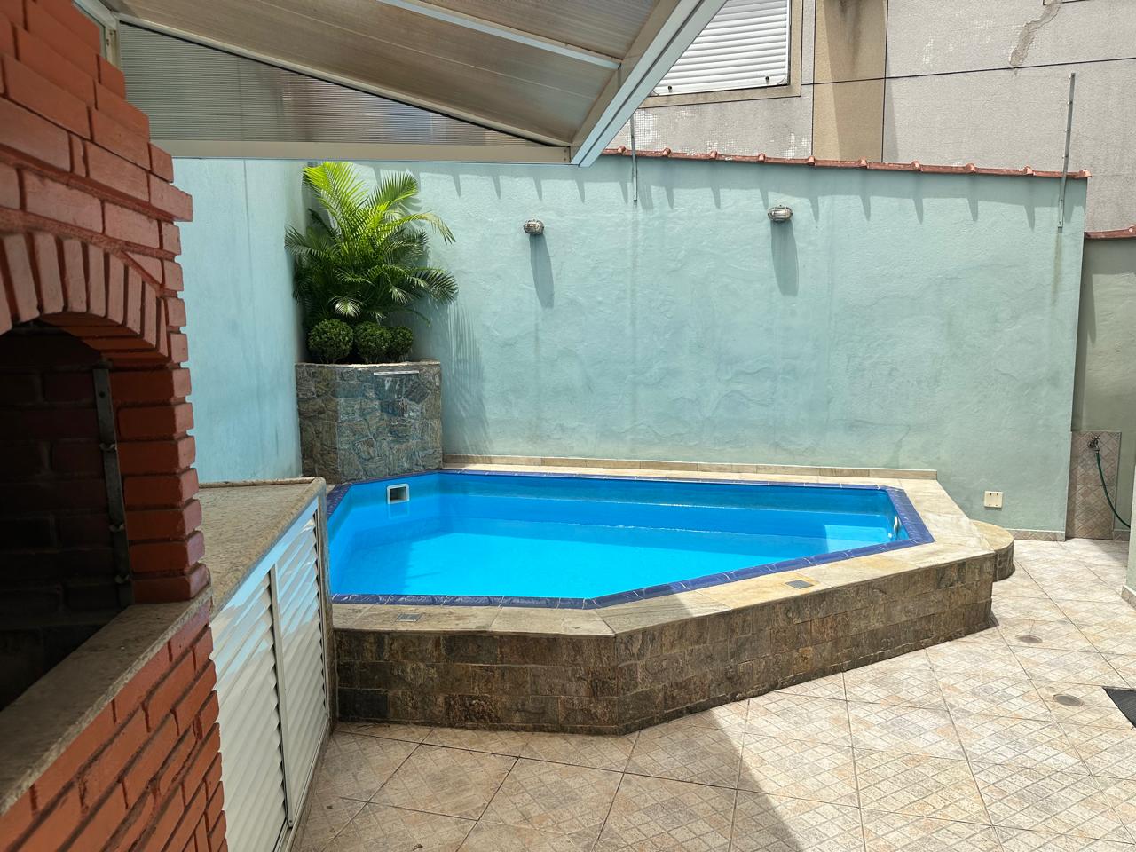 Churrasqueira coberta e piscina com cascata.